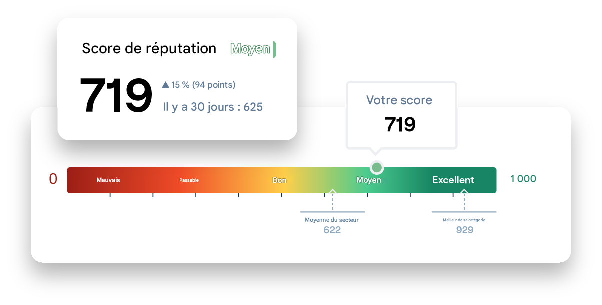 Le Score de Réputation est une métrique globale qui évalue la perception d’une entreprise en ligne, en combinant des avis clients, des mentions sur les réseaux sociaux, et d’autres sources de feedback. Cela permet de donner une vision complète de la réputation d’une entreprise.