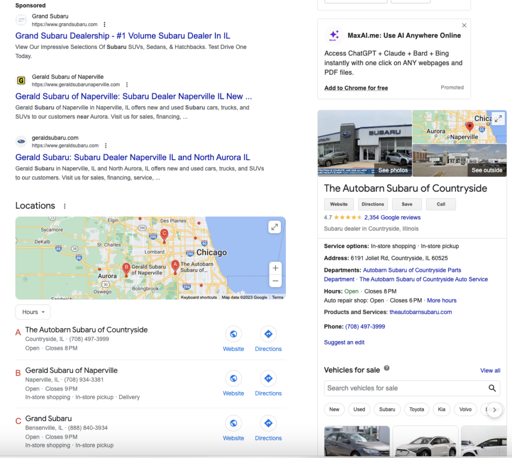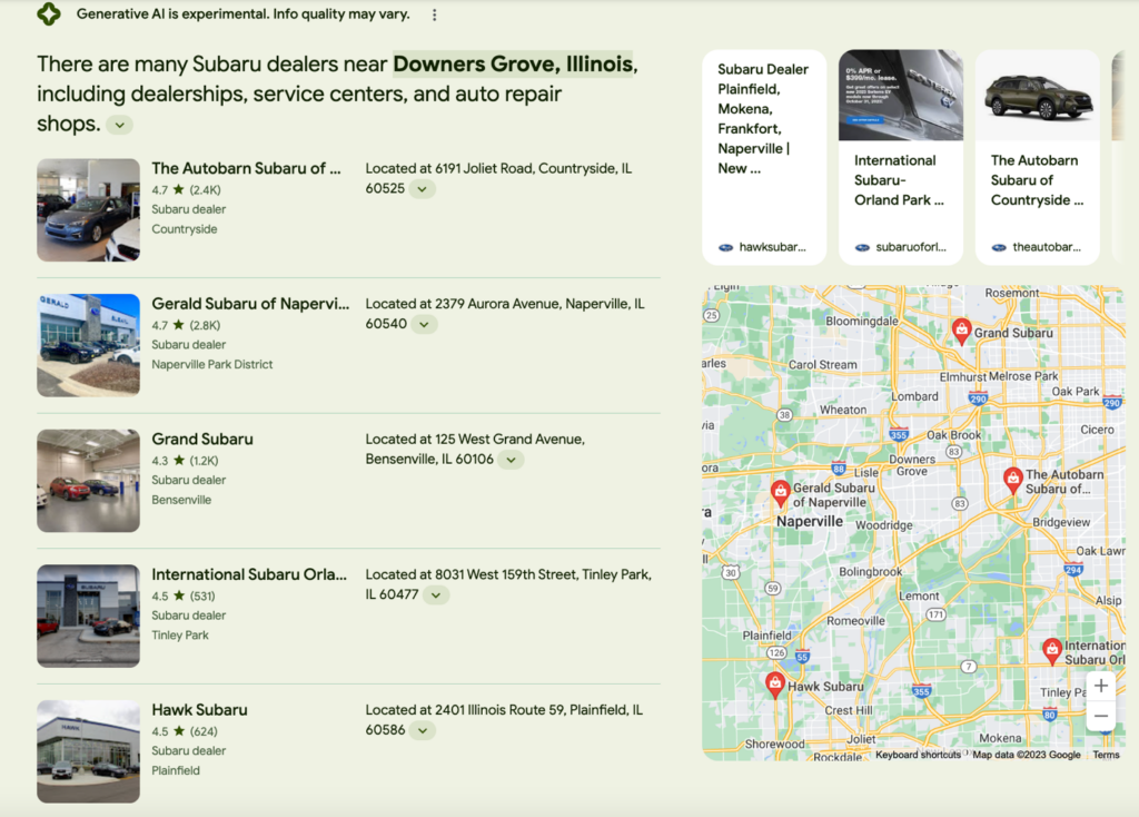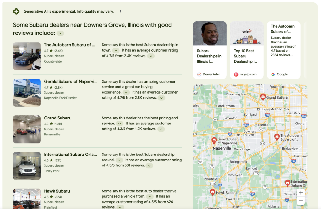 SGE changes how people search for businesses locally. Reputation CMO Liz Carter illustrated this point well when she described how the traditional search is changing. To borrow from Liz’s post: Let’s say you search for “Subaru dealers near me.” If you use traditional Google search, results will consist of a bunch of sponsored links and a 3-pack (a format for displaying top results for business pages):