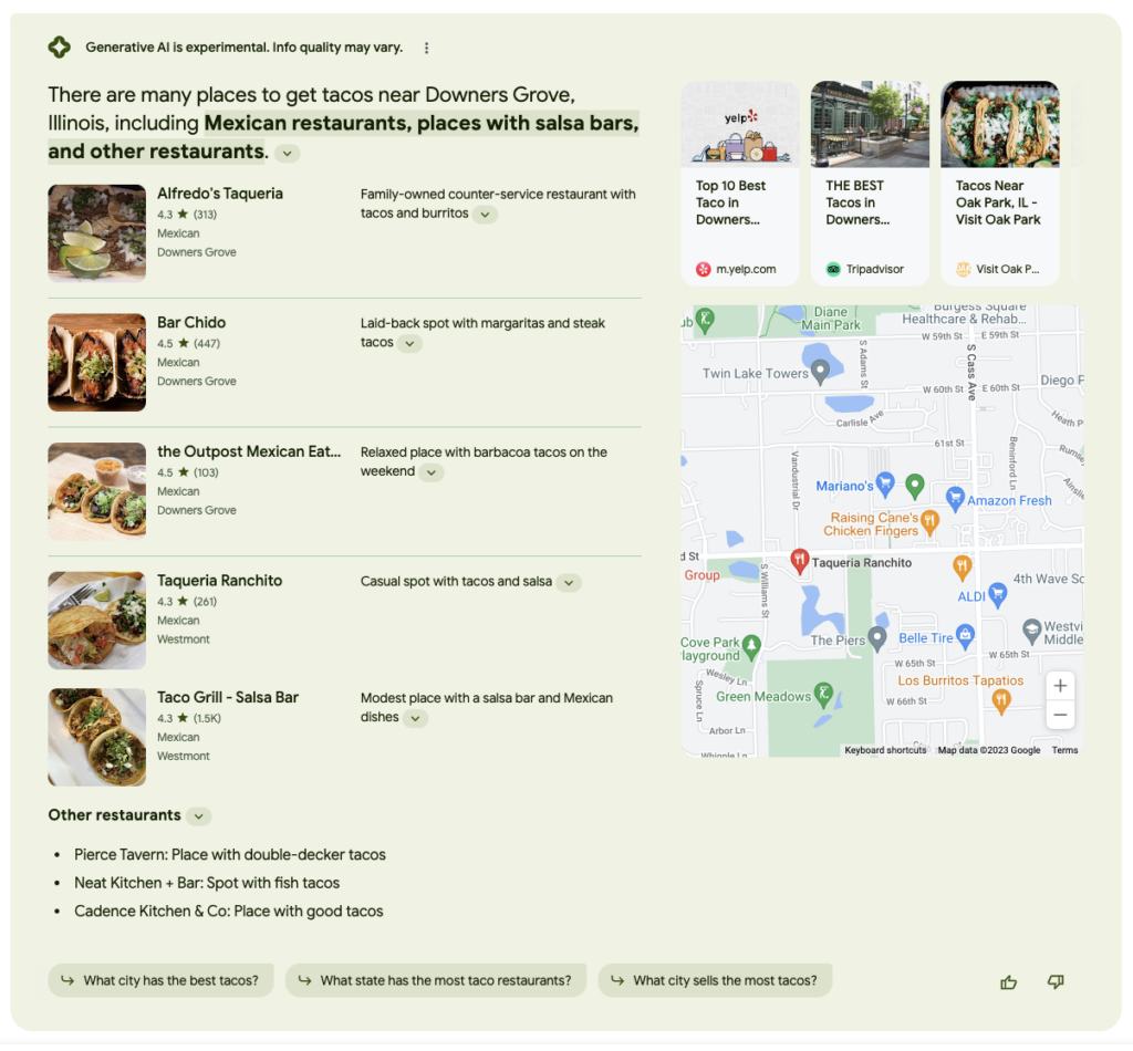 This experience is similar for non-branded searches, say “best tacos near me,” which reveals descriptive answers about restaurants that serve tacos and also get the best ratings/reviews – and remember, these results appear above any other organic and paid search results. Also note the additional details such as “laid-back spot with margaritas and steak tacos” and “barbecue tacos on the weekend.”