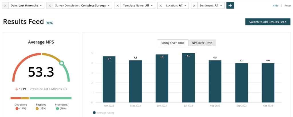Getting the most out of your survey results means you should be able to look at the data in the way that’s most meaningful to you, such as filtering your survey data by date, location, sub-brand, or sentiment. Having clear, simple charts and visualizations will help to highlight important feedback themes more-so than text or tabular data. These visualizations should also dynamically update according to the filters you’ve set, as is the case in Reputation’s new Survey Results Feed.