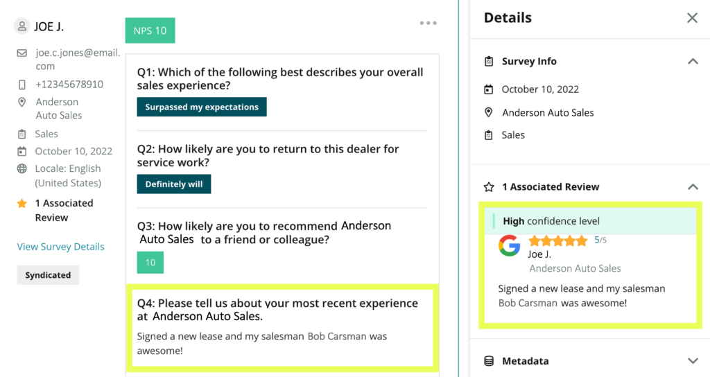 When reviewing your survey results, it can be extremely helpful to be able to see which responses have also been published externally as a public review — as Reputation does with our Associated Reviews feature — and which responses have been used to generate a support ticket. This information can create much-needed collaboration between Marketing, CX, and Support teams, and help prioritize customer outreach.